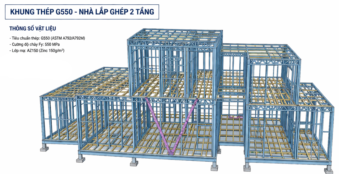 Trong các công trình nhà lắp ghép hiện nay, khung thép siêu nhẹ G550 đóng vai trò là hệ kết cấu chính, quyết định trực tiếp đến độ bền, độ ổn định và tuổi thọ công trình.