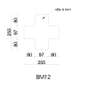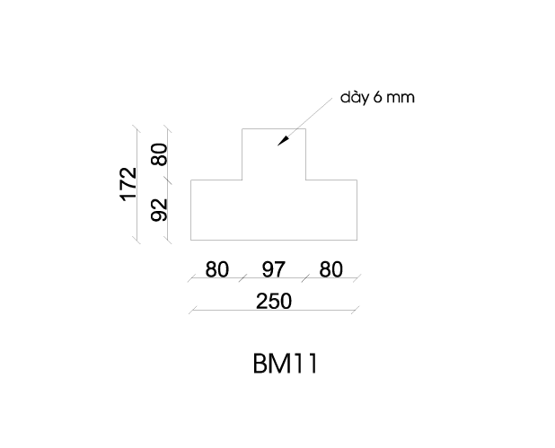 Bản mã thép BM11 có kích thước tổng thể 250 mm theo phương ngang và 172 mm theo phương đứng. Cấu trúc được chia thành ba đoạn 80 mm – 97 mm – 80 mm, tạo thành hình dạng đối xứng giúp cân bằng lực hai bên.