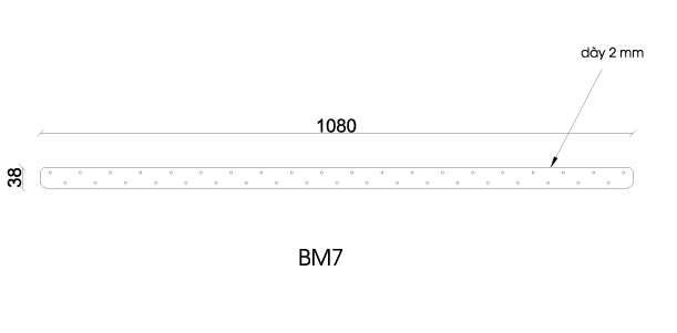 Bản mã thép BM7 là chi tiết liên kết dạng thanh dài, được thiết kế để xử lý các nút giao phức tạp giữa dầm – sàn – vách trong hệ kết cấu thép nhẹ. Với chiều dài lên tới 1080 mm, BM7 không chỉ đơn thuần là bản mã liên kết mà còn đóng vai trò như một “thanh phân phối lực dọc”, giúp các cấu kiện làm việc đồng thời thay vì rời rạc.