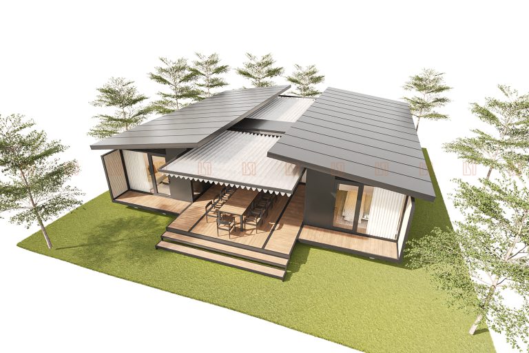 Phối cảnh ba chiều khung thép G550 163.6m2 mái chéo với thiết kế tối ưu cho công trình nghỉ dưỡng