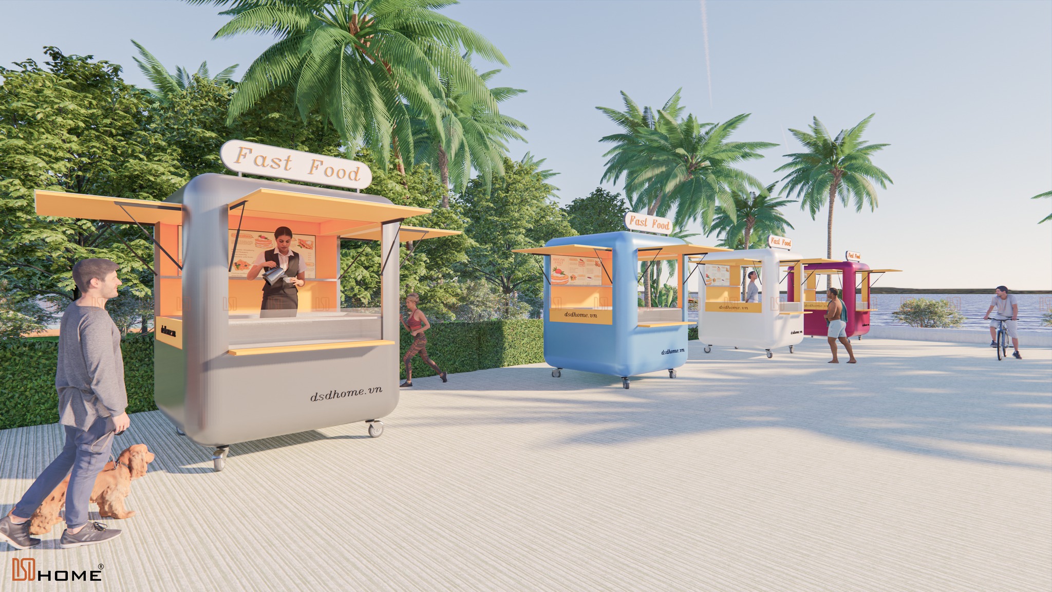 Đặc biệt, với mục đích hướng đến sự đồng bộ và tính thẩm mỹ trong cảnh quan đô thị, kiot bán hàng lưu động của DSDhome rất thích hợp cho các dự án tại các bãi biển, tuyến phố đi bộ, chợ đêm,…