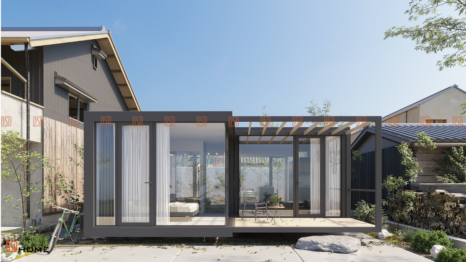 Với mong muốn mang đến không gian linh hoạt và đa dạng công năng, DSDhome ra mắt giải pháp nhà lắp ghép thông minh với kỹ thuật sắp xếp từ module, dễ dàng lắp đặt, lên tầng và sở hữu thiết kế thẩm mỹ cao. Thiết kế nhà lắp ghép 48m2 là sự kết hợp hài hoà giữa nét hiện đại và truyền thống khi sở hữu không gian nghỉ dưỡng hiện đại và mái hiên gần gũi thiên nhiên. Module được sắp xếp sáng tạo và linh hoạt phù hợp với khổ đất vuông.