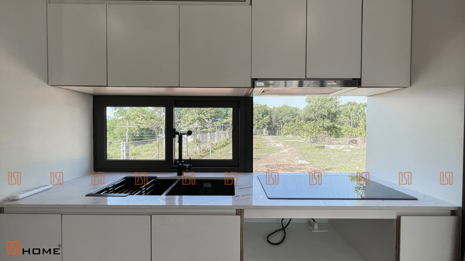 - Kính: Sử dụng kính cường lực tạo vách ngăn cho công trình. Thiết kế 3 mặt tiền kính giúp mở rộng view, tăng trải nghiệm sống, hòa mình với thiên nhiên cho người dùng.