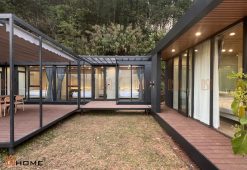 Homestay được thiết kế theo hình dáng chữ U, lưng tựa vào núi và mặt tiền hướng ra khung cảnh thiên nhiên rộng lớn. Với mục tiêu phục vụ nội bộ công ty và khả năng kinh doanh homestay trong tương lai, công trình được bố trí đầy đủ công năng hiện đại và tiện nghi.