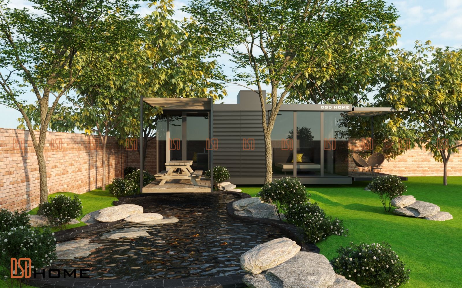 Nhà lắp ghép Phú Thọ được thiết kế ở địa hình tương đối đặc biệt. Mặt bằng đất đỏ là chủ yếu, theo yêu cầu của chị H thì công trình có hồ trước mái hiên, xung quanh nhà trồng nhiều cây xanh.