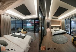 Phòng ngủ master được trang bị giường kích thước 1m8 x 2m, hệ thống rèm và trần xuyên sáng tự động, cùng với các cổng sạc thông minh, mang lại trải nghiệm sống tiện lợi và sang trọng.