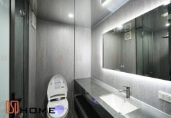 Khu vệ sinh ứng dụng tấm PVC chống nước thẩm mỹ cao, kết hợp toilet tự động, gương cảm ứng đa chức năng và vòi sen thông minh.
