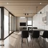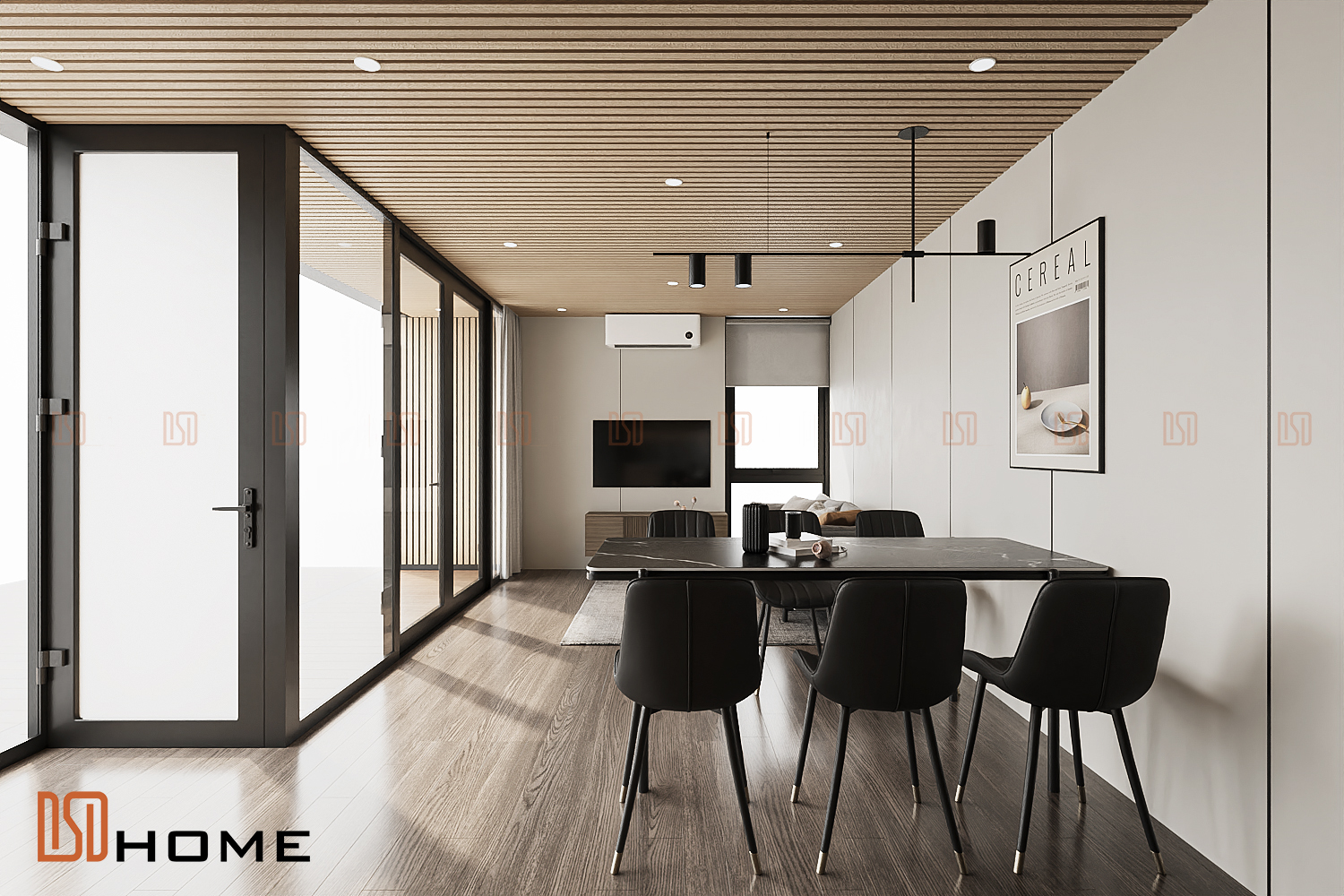 Phong cách thiết kế: Sử dụng những đường nét phẳng, gọn gàng, loại bỏ hoàn toàn các chi tiết rườm rà. Hệ cửa kính lớn giúp kết nối không gian bên trong với ánh sáng tự nhiên, làm nổi bật các khối màu gỗ sồi & xám trung tính.