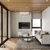 Màu sắc chủ đạo: Tone gỗ sồi nhạt chiếm chủ đạo ở trần nan gỗ và hệ tủ kệ, kết hợp hài hòa với mảng tường ghi sáng, tạo nên chiều sâu thị giác đầy ấn tượng.