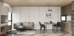 Nội thất phòng khách DSDhome tuân thủ phong cách thiết kế hiện đại với những đường nét tối giản để tạo cảm giác thoải mái nhưng vẫn đầy đủ tiện nghi. Thiết kế sử dụng tông màu trung tính chủ đạo kết hợp với các yếu tố tương phản tinh tế để tạo điểm nhấn thị giác sâu sắc cho không gian.