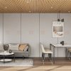 Màu sắc chủ đạo: Tone vàng nâu chiếm chủ đạo ở trần nan gỗ và hệ tủ kệ, kết hợp hài hòa với mảng tường & sofa ghi sáng, tạo nên chiều sâu thị giác đầy ấn tượng.