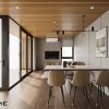 Phong cách thiết kế: Sử dụng những đường nét phẳng, gọn gàng, loại bỏ hoàn toàn các chi tiết rườm rà. Hệ cửa kính lớn giúp kết nối không gian bên trong với ánh sáng tự nhiên, làm nổi bật các khối màu ghi xám trung tính.