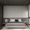 Thiết kế tối giản, tinh tế: Giường ngủ được thiết kế dạng khối thấp hiện đại, kết hợp với hệ tủ quần áo âm tường màu xám đồng bộ tạo nên một chỉnh thể thống nhất. Ánh sáng được bố trí giấu sau vách đầu giường tạo điểm nhấn ấm áp và lãng mạn.