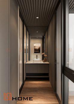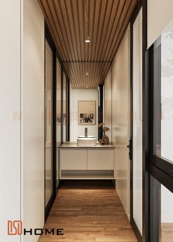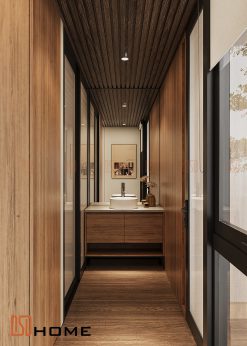 Phong cách thiết kế: Tiếp nối ngôn ngữ thiết kế tối giản hiện đại, phòng vệ sinh được tối ưu hóa diện tích thông qua việc sắp xếp các cấu kiện một cách khoa học. Điểm nhấn nằm ở sự tương phản nhẹ nhàng giữa các mảng tường sáng và hệ nội thất màu gỗ nhẹ nhàng, tạo nên cảm giác thư giãn tuyệt đối như tại các khu nghỉ dưỡng cao cấp.